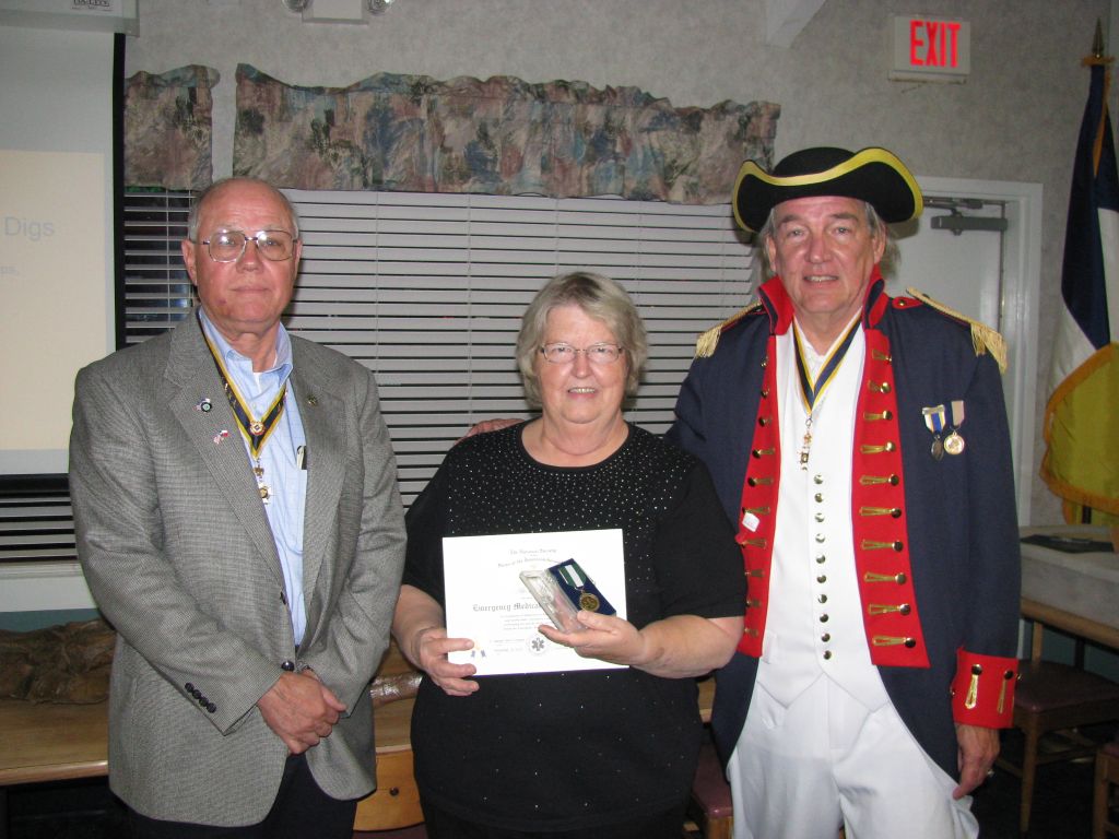Naranjo then called Darleen Jones forward. Darleen Jones and Alton Mericle are EMS personnel in Groveton. They purchased a vehicle in the 80's and have operated it everysince without pay. Darleen recounted a story about a man who was shot in Groveton, I believe in a bank. They didn't have any Emergency Medical Vehicles so they called one from Crockett. By the time they got the man to the hospital, he died. It was decided then that they would start their own service. Alton could not be at the meeting and will be awarded a medal and certifcate at a later date. Darleen accepted a medal and will receive her Certificate later. (We were short on medals and certificates).