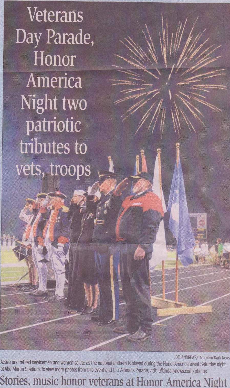 Also, on November 6, Neal Naranjo, the drummer and Fred Preston, participated in the Honor America night festivities at the Lufkin High School Stadium. One of the first things to occur in this pagent is for members of the armed forces to post their colors.