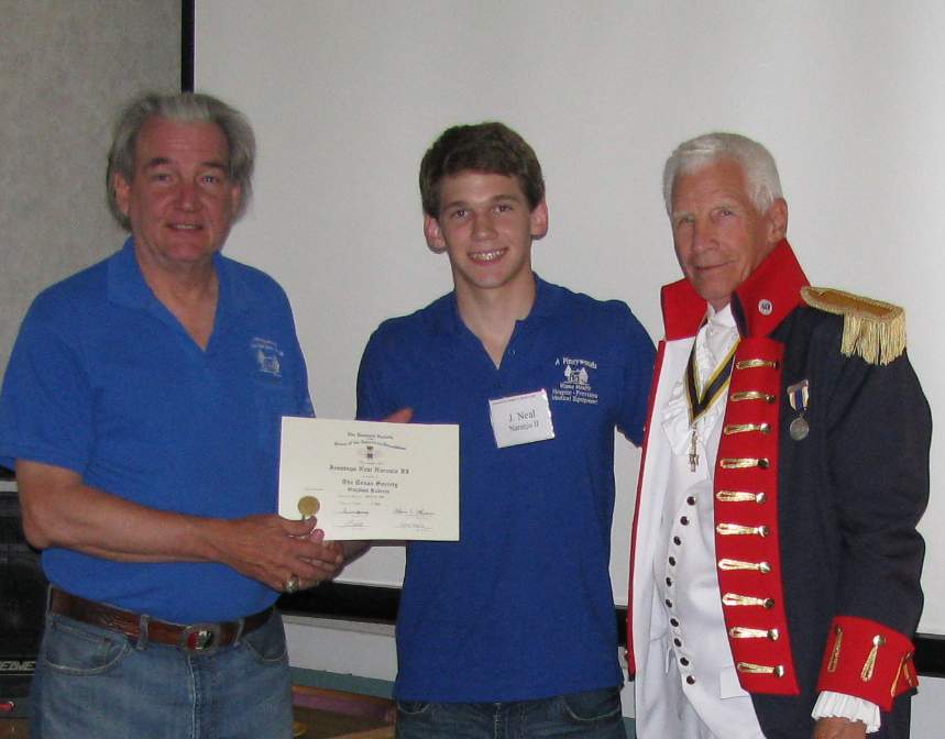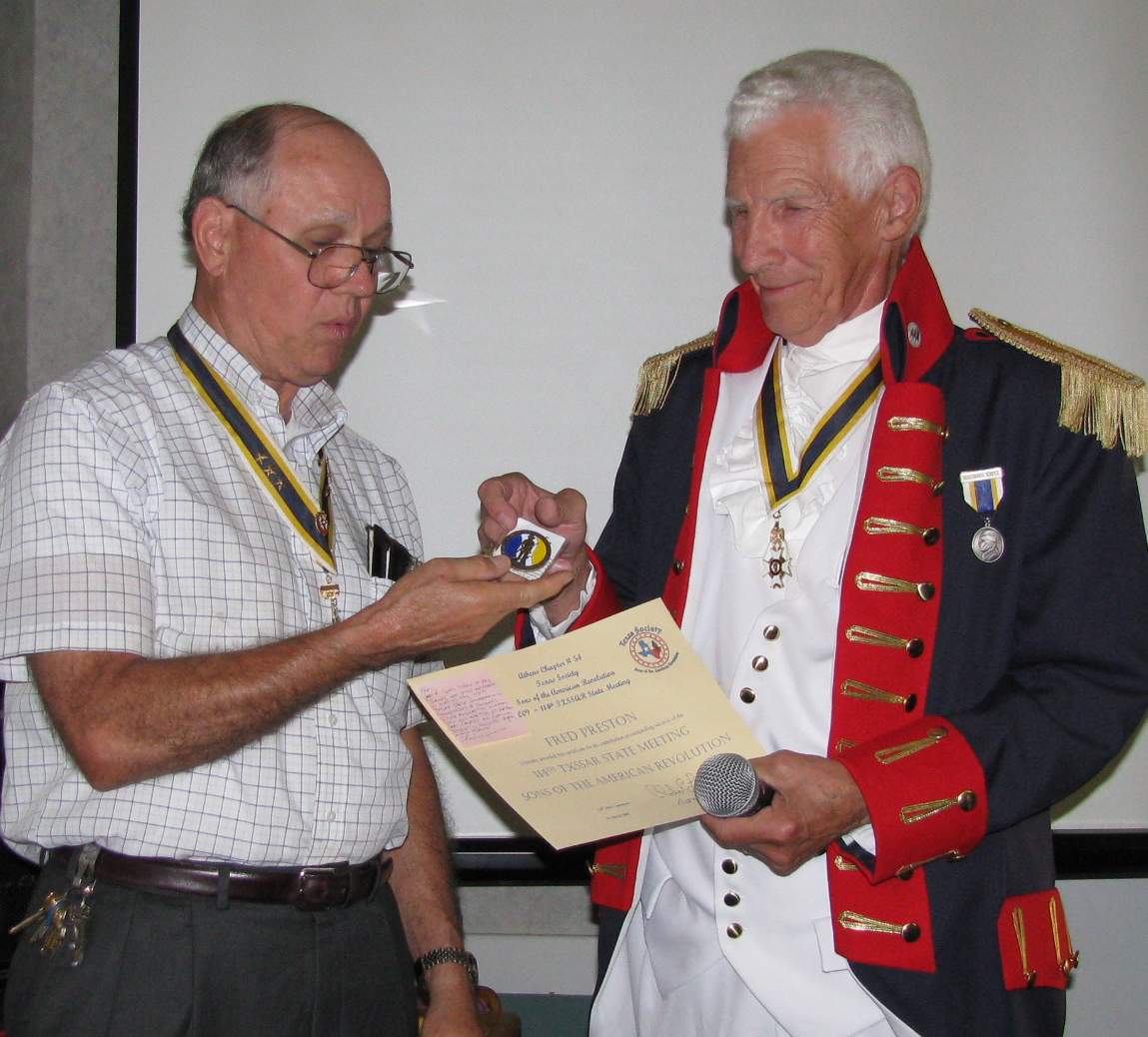 Mike Everheart then came forward and presented Fred Preston with a certificate and medal from the Athens Chapter for participation in the annual meeting. Preston created a web page advertising the State meeting and also manned the display of Revolutionary Artifacts supplied by Naranjo.