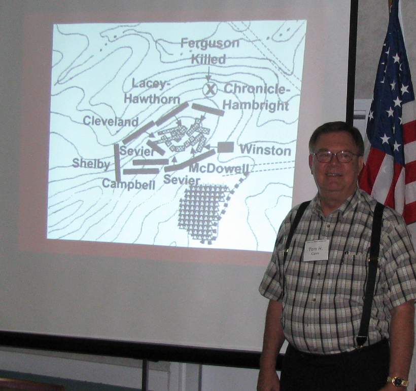 There being no other new business, Naranjo introduced the speaker, Tom Gann who gave a very good presentation on the events leading up to and the battle of King's Mountain. Ignatious Nathan Gann was a participant and believed to be one of the men who shot Ferguson. The chapter was of course named after Nathan Gann. Preston reported that his ancestor, Robert Preston, reported at the Wataugo River but Col. Campbell dismissed him since he had been married 3 days prior. Listening to the description of the battle, Campbells forces were hit hard and I am lucky my ancestor wasn't there.