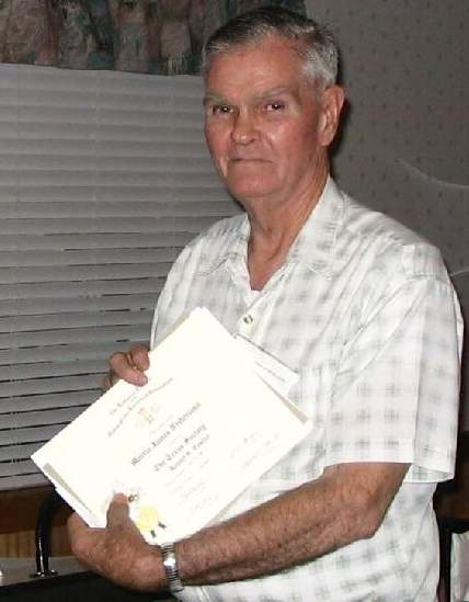 New Members: President Preston called Gary McClinton to come forward and get his certificate, card and pIn. Gary is a doctor from Nacogdoches and was approved as a member on July 27th. Then Martin Netherland was called forward to receive his certificate and pin. Martin is from Nacogdoches and he to was approved July 27th. Thornton Savage who has transferred his membership from the Fredonia Chapter to our chapter could not be present.