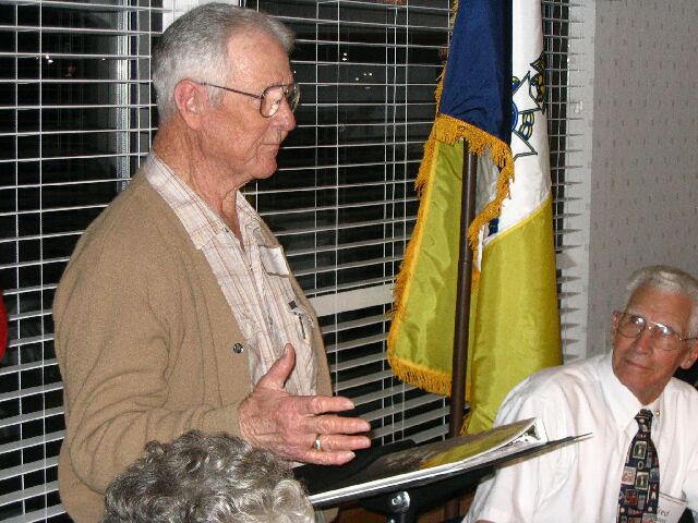 Fred Preston then introduced the speaker for the evening, Ben Pyle. Known to many as the President of the Angelina Genealogy Society, a native of Apple Springs, veteran of WWII and Korea, degrees in finance from Univ. of Houston, SMU and Southern Cal. also a Master of Arts in Religion form Liberty Univ. Ben is currently retired from commercial banking and finance and is leisurely working at farming. His subject was "Pyle's Massacre in 1781". Seems his ancestor was a Loyalist whose army was defeated but later Pyle joined with George Washington to help defeat the British.