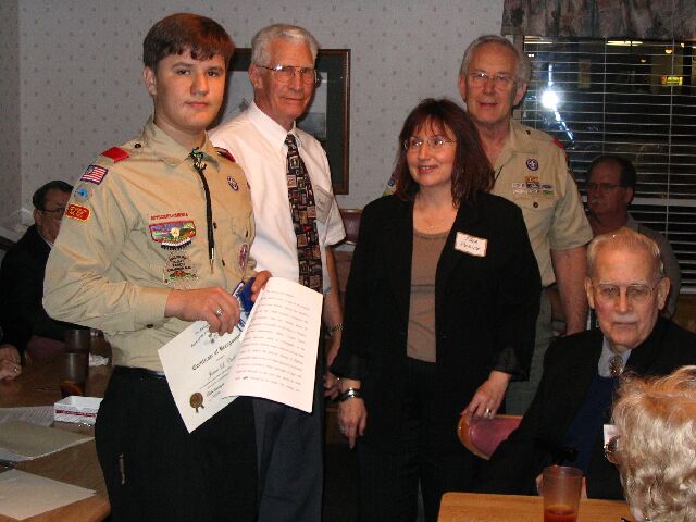 At this time, President Preston read from James Carlin's application for the Eagle Scout Scholarship and Recognition program. James appears to have an outstanding career in the Scouts and will be a good applicant to represent our chapter in the State Competition. James also has a grandmother who is/was a member of the DAR so he might join our group one of these days. He is also young enough to compete again in 2005/06. James was called to the front to receive his certificate, medal, patch and check for $100. Pictures were taken with James, Mike Cotton - troop leader for troop 518 sponsored by Kiwanis and Tina Peavy - Boy Scout District Chair in 2003 and 2004.